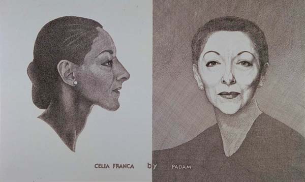 1987 ink drawings, profile and front, of Celia Franca, British dancer who founded the National Ballet of Canada. Wiseman danced with this company under her direction for four years.
