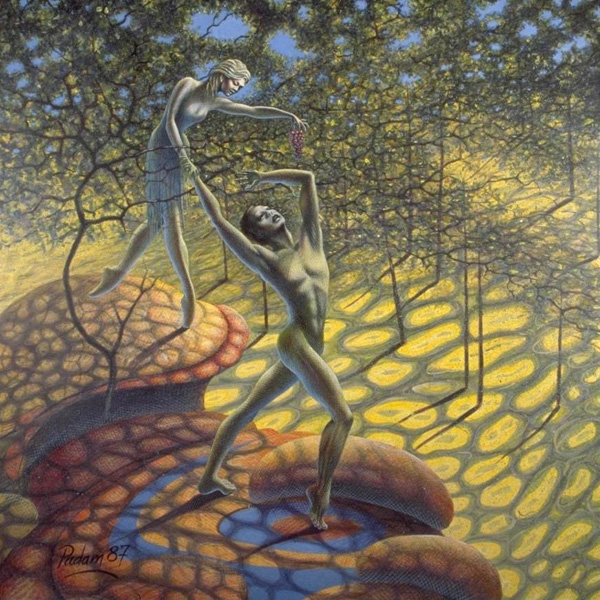 "The original drawing was done with Pelican inks. These inks fade to nothing, so I had slides made, which were the source of paintings that followed ten years later. I started with oils, but decided that working with oils and thinners was too toxic, so this painting was done with acrylics."