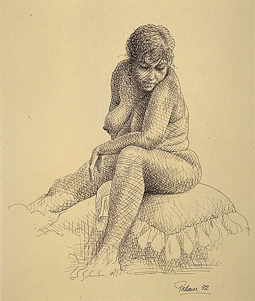 This is an original ink drawing of model Gyatta, completed in 1992. Padam attended life drawing sessions at Basic Inquiry in Vancouver, and over hundreds of hours, produced several hundred drawings. "Gyatta" was completed in two hours.